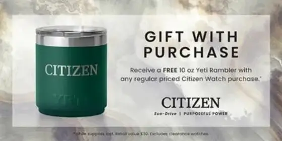 While supplies last! Shop in store and receive a free 10 oz Yeti Rambler with any regular priced Citizen Watch purchase.
