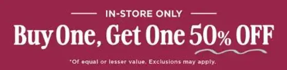 Save now! Shop in store and buy one, get one 50% off on sale items.